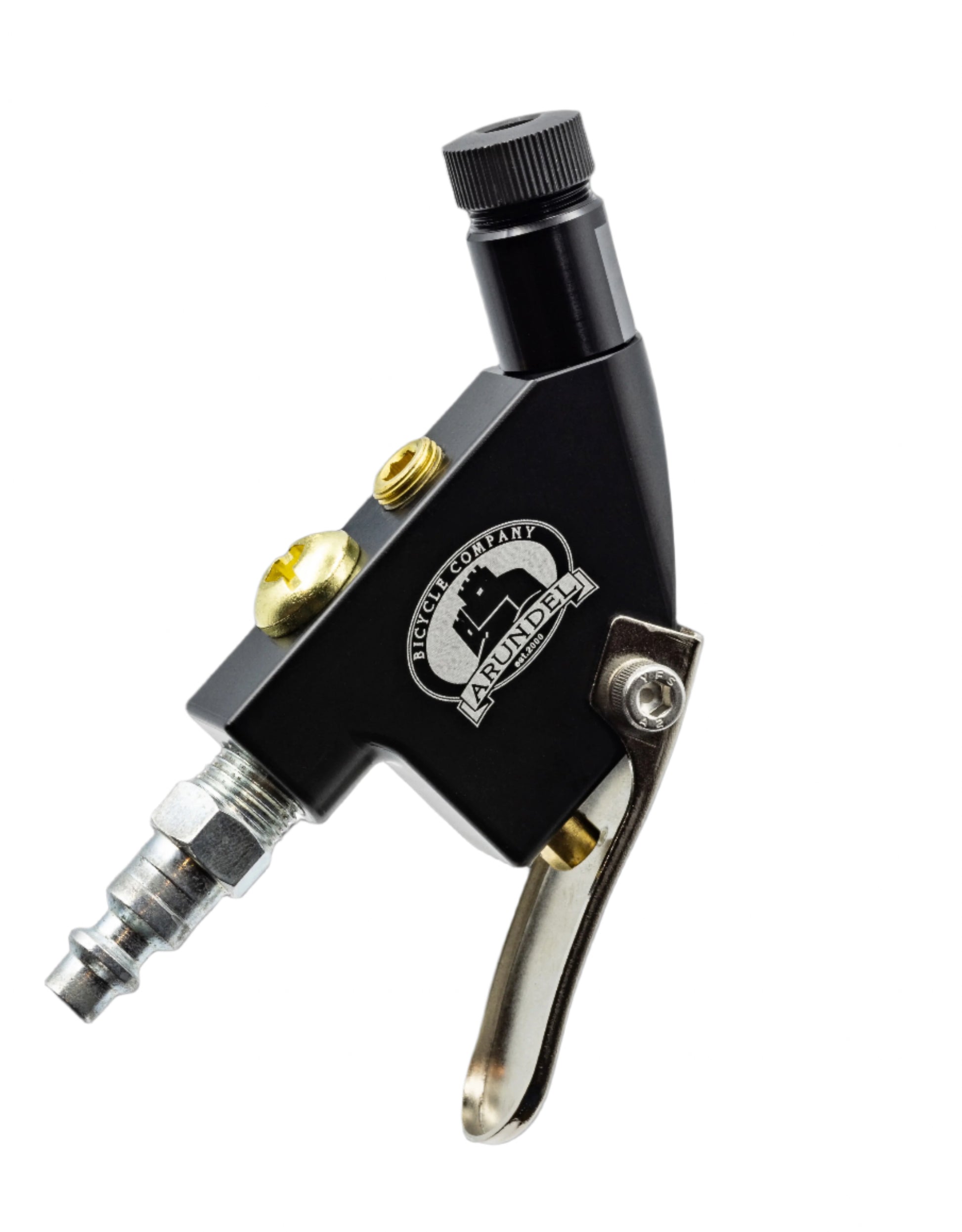 The CNC Nugget is a new, compact version of our popular Presta Shop Inflator, for use with air compressors. The body is CNC machined aluminum with cross-drilled internal air passages, so when fitted with an accessory gauge (not included), it reads tire pressure rather than airline pressure, a shared feature with our original inflators.